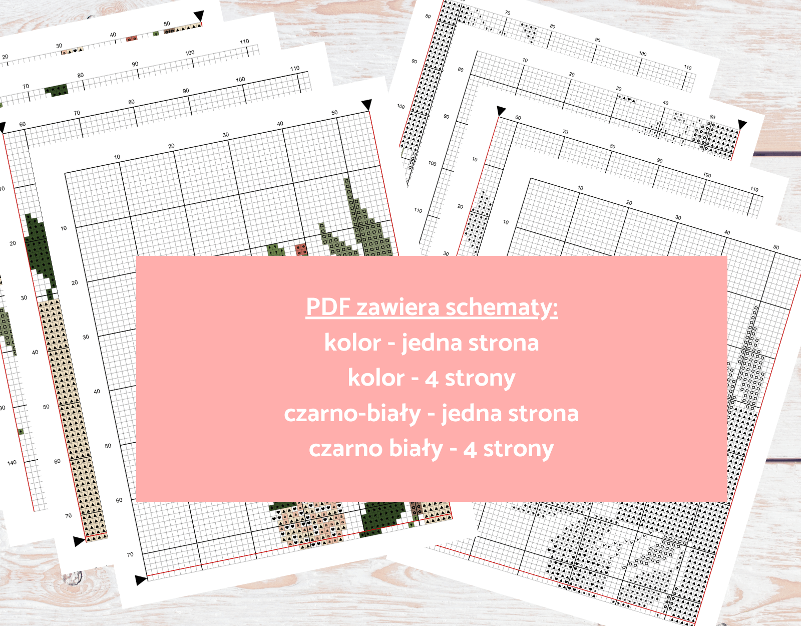 - Informacje dotyczące wielkości wzoru oraz użytych kolorów (kolorystyka mulin DMC),