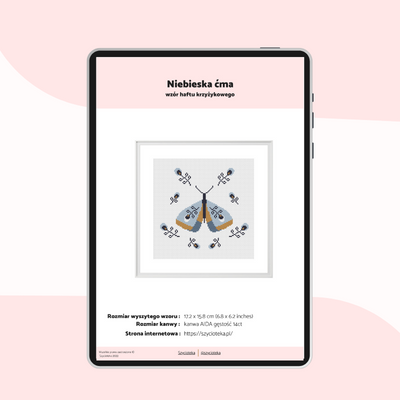 - Informacje dotyczące wielkości wzoru oraz użytych kolorów (kolorystyka mulin DMC),